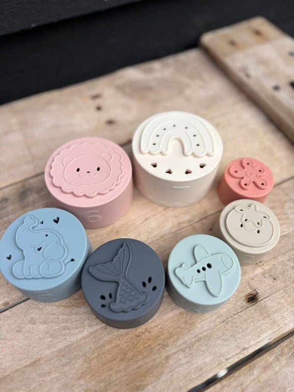 Deze stapelbekers zijn ideaal voor baby’s en peuters: ze stimuleren de fijne motoriek, zijn veilig om op te kauwen, en geschikt voor bad of strandspeelplezier.